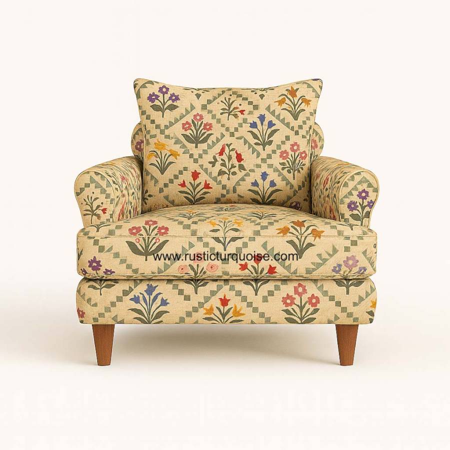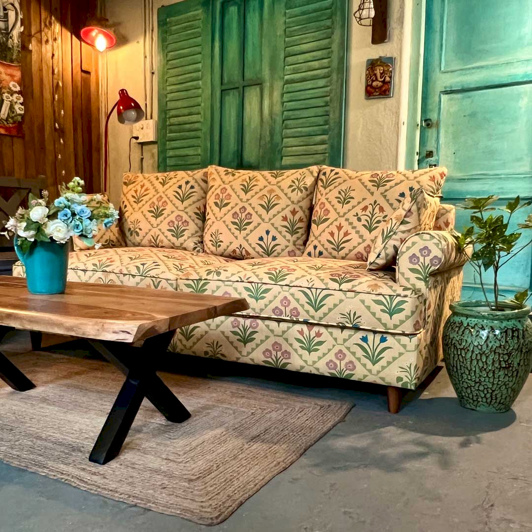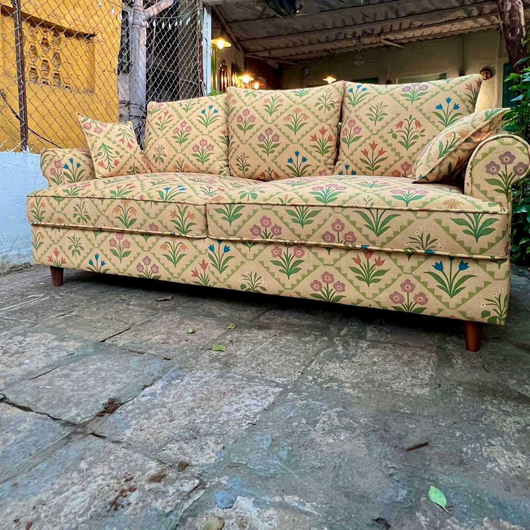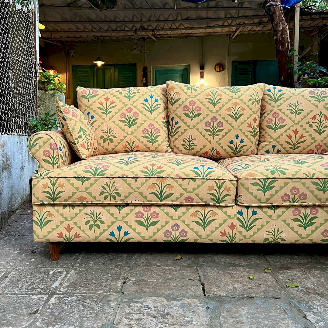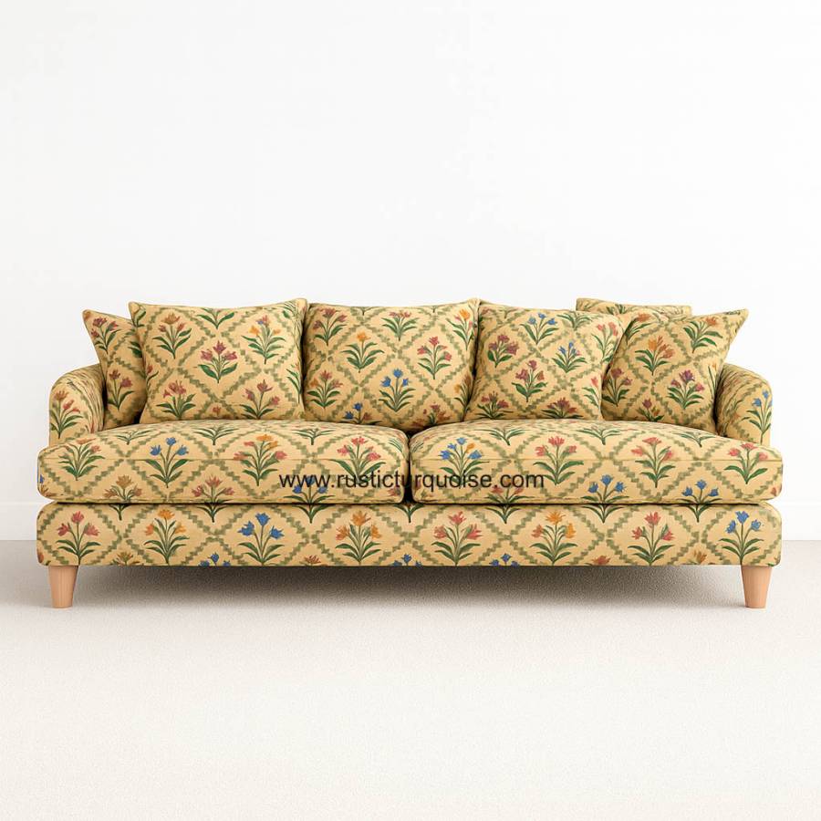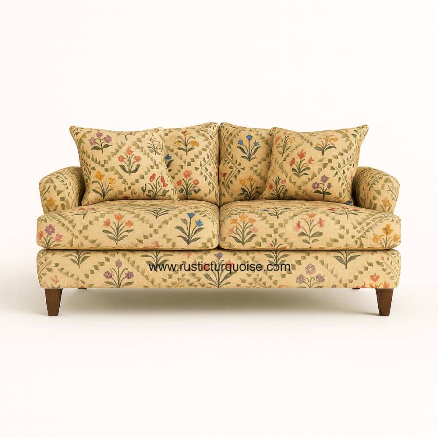 Tulip Bloom Linen Beige Multi Floral Printed Comfy Sofa
